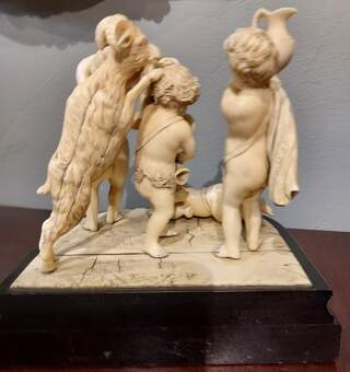 Home›Antigüedades varios›Esculturas en madera›Antiguo grupo de marfil con cupidos que bailan y tocan música.